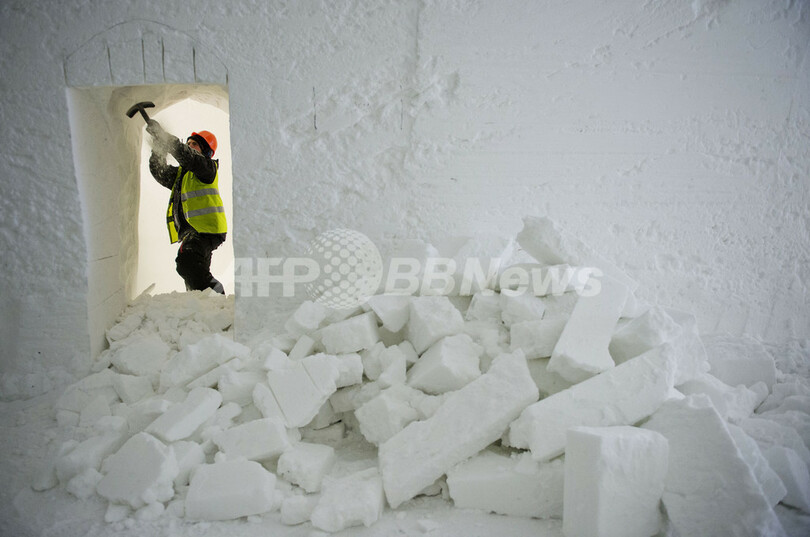 写真は、新設中のアイスホテルの客室(2012年11月16日撮影)。(c)AFP/JONATHAN NACKSTRAND