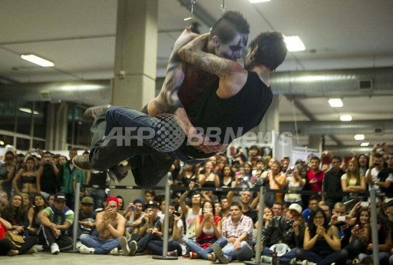 南米コロンビアのアンティオキア(Antioquia)州メデジン(Medellin)で16日、第3回国際タトゥー大会(International Tattoo Convention)が開催された。写真は背中にフックをかけて宙づりになった男性たち(2012年11月16日撮影)。(c)AFP/Raul ARBOLEDA