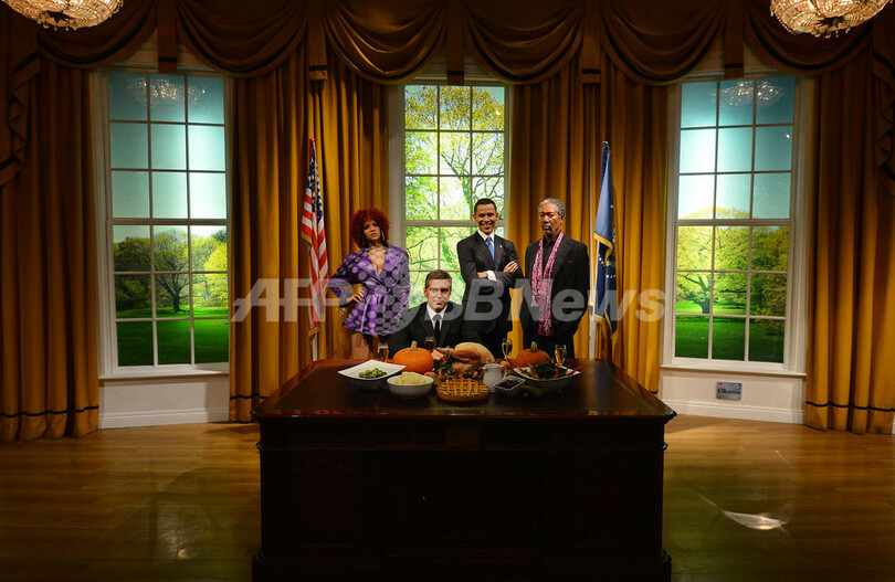 【11月22日 AFP】英ロンドン(London)のマダム・タッソー(Madame Tussauds)ろう人形館で21日、感謝祭の祝日に合わせ、お祝いのごちそうが並んだ米大統領執務室が再現された。