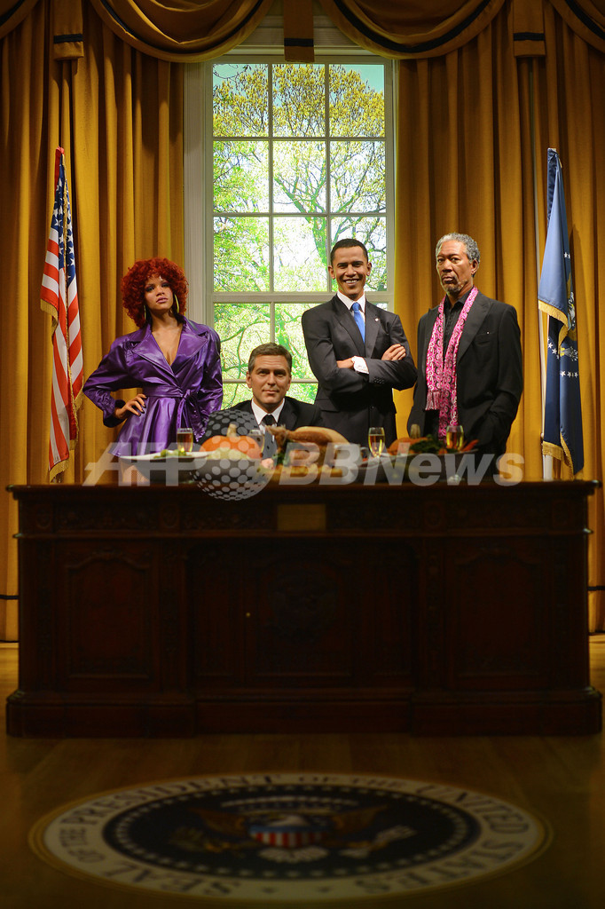 【11月22日 AFP】英ロンドン(London)のマダム・タッソー(Madame Tussauds)ろう人形館で21日、感謝祭の祝日に合わせ、お祝いのごちそうが並んだ米大統領執務室が再現された。