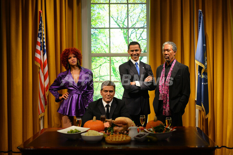 【11月22日 AFP】英ロンドン(London)のマダム・タッソー(Madame Tussauds)ろう人形館で21日、感謝祭の祝日に合わせ、お祝いのごちそうが並んだ米大統領執務室が再現された。