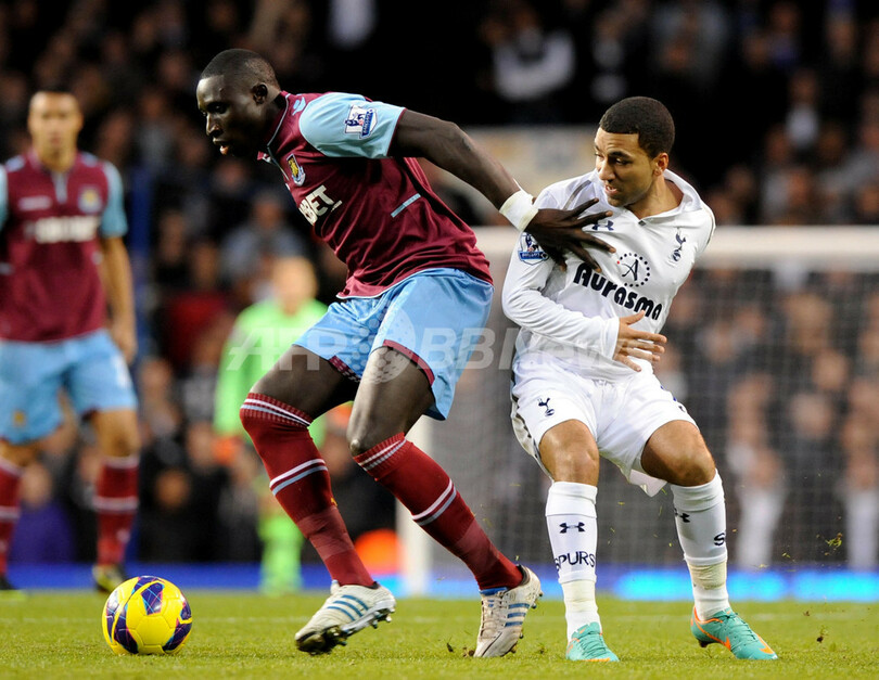 トッテナム・ホットスパーのアーロン・レノン(Aaron Lennon、右)とボールを競るウェストハムのモディボ・マイガ(Modibo Maiga、2012年11月25日撮影)。(c)AFP/OLLY GREENWOOD