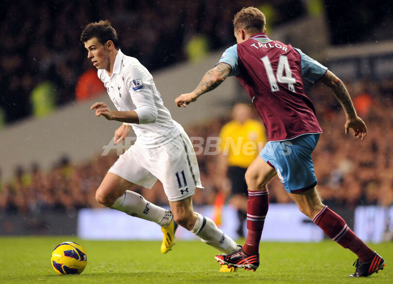 ウェストハムのマット・テイラー(Matt Taylor、右)を振り切ってボールを運ぶトッテナム・ホットスパーのギャレス・ベイル(Gareth Bale、2012年11月25日撮影)。(c)AFP/OLLY GREENWOOD