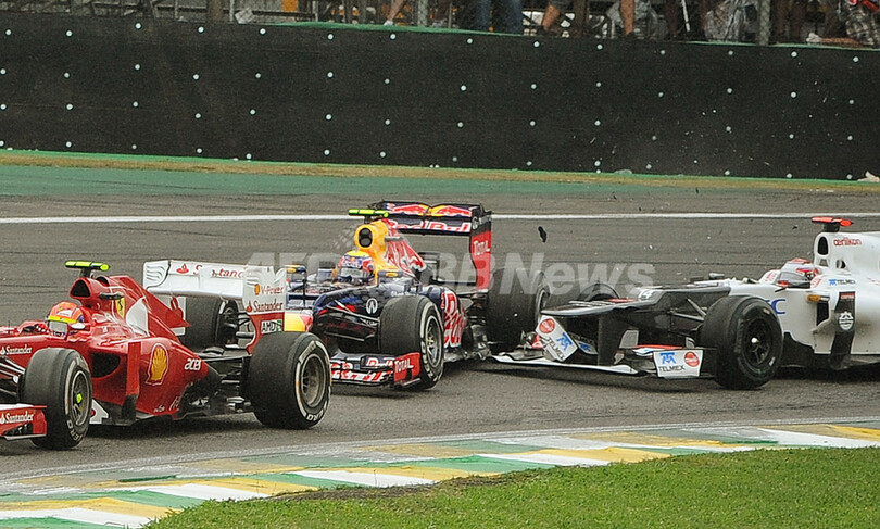 レッドブルのマーク・ウェーバー(Mark Webber、中央)のマシンと接触するザウバー(Sauber)の小林可夢偉(Kamui Kobayashi、右、2012年11月25日撮影)。(c)AFP/NELSON ALMEIDA