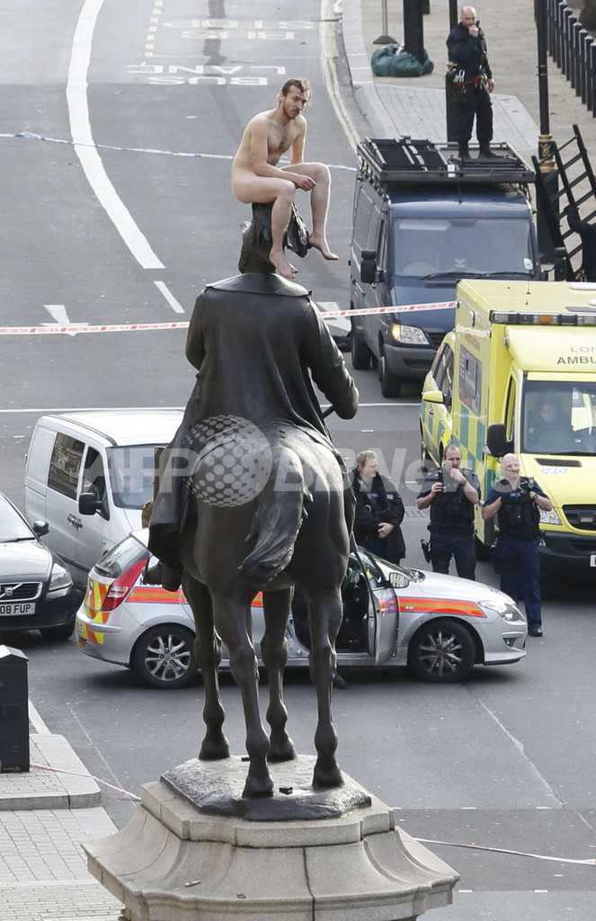 全裸男が銅像の上に3時間、英ロンドンの首相官邸近く