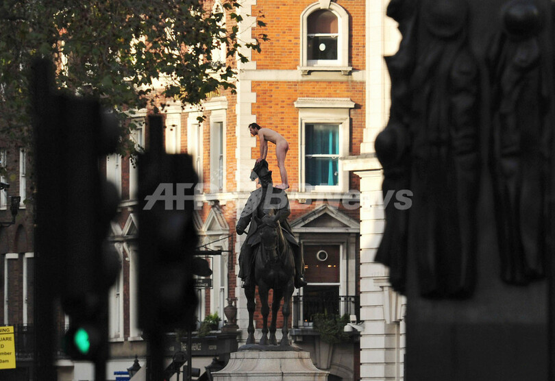 【11月26日 AFP】英ロンドン(London)中心部の首相官邸に程近い大通りで23日、中央分離帯に立つ銅像に全裸の男がよじ登り、付近の交通を3時間にわたって遮断する事件があった。
