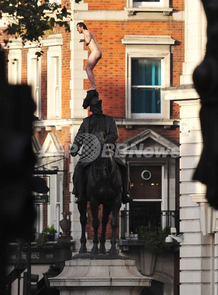 【11月26日 AFP】英ロンドン(London)中心部の首相官邸に程近い大通りで23日、中央分離帯に立つ銅像に全裸の男がよじ登り、付近の交通を3時間にわたって遮断する事件があった。