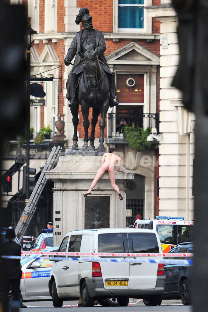【11月26日 AFP】英ロンドン(London)中心部の首相官邸に程近い大通りで23日、中央分離帯に立つ銅像に全裸の男がよじ登り、付近の交通を3時間にわたって遮断する事件があった。