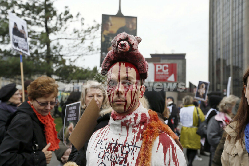 ニュース 環境・科学 毛皮に反対、仏2都市で抗議活動 2012年11月27日 13:07 発信地:パリ/フランス [ ヨーロッパ フランス ] このニュースをシェア ‹ › ❮ 9/9 ❯ フランスの首都パリ(Paris)と南部マルセイユ(Marseille)で24日、毛皮の使用に反対する抗議活動が行われた。パリでの抗議で、血のりまみれのアライグマのぬいぐるみを頭に乗せた参加者(2012年11月24日撮影)。(c)AFP/KENZO TRIBOUILLARD 画像作成中 ! 【11月27日 AFP】フランスの首都パリ(Paris)と南部マルセイユ(Marseille)で24日、毛皮の使用に反対する抗議活動が行われた。中には血のりを体に施した参加者の姿も見られた。(c)AFP 環境・科学 一覧へ> メディア・報道関係・法人の方向け 写真・動画 購入のお問合せ>
