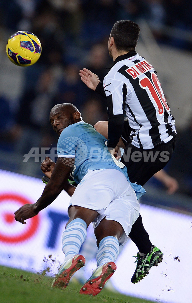 ウディネーゼのアントニオ・ディ・ナターレ(Antonio Di Natale、右)とボールを競るラツィオのミカエル・シアーニ(Michael Ciani、2012年11月27日撮影)。(c)AFP/FILIPPO MONTEFORTE