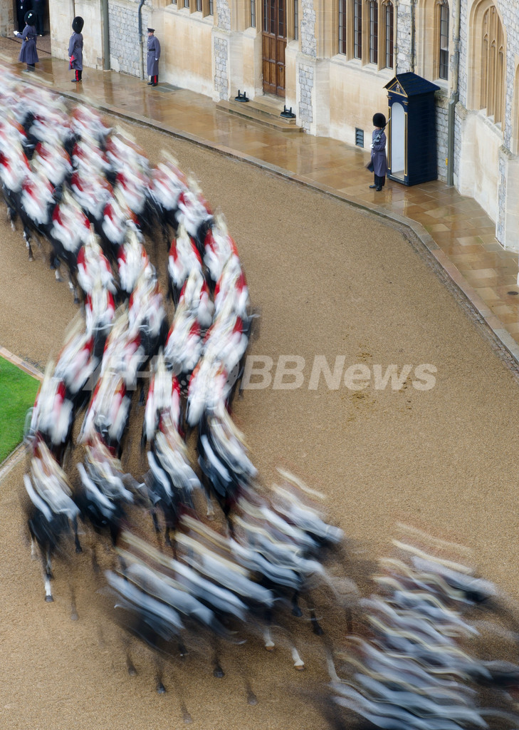 Windsor Castle)で27日、中庭を行進する兵士たち。ウィンザー城ではこの日、英国を公式訪問中のクウェートのサバハ・アハマド・ジャビル・サバハ(