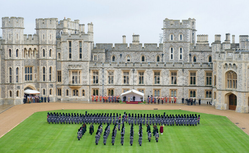Windsor Castle)で27日、中庭を行進する兵士たち。ウィンザー城ではこの日、英国を公式訪問中のクウェートのサバハ・アハマド・ジャビル・サバハ(