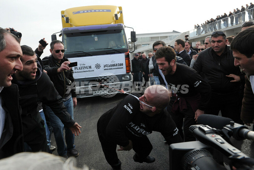 片耳で8トントラックを動かすギネス記録、グルジア男性が挑戦
