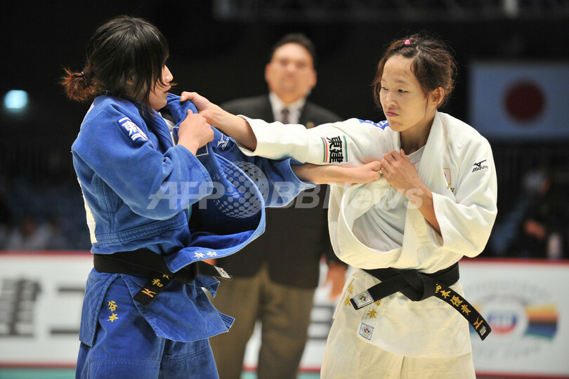 女子52キロ級決勝で谷本和(Nodoka Tanimoto、左)と対戦する橋本優貴(Yuki Hashimoto、2012年11月30日撮影)。(c)AFP/KAZUHIRO NOGI