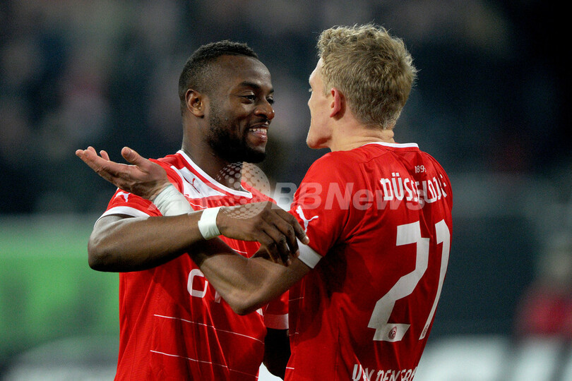 後半13分に得点を挙げ、チームメイトのヨハネス・ファン・デン・ベルフ(Johannes van den Bergh、右)と喜ぶフォルトゥナ・デュッセルドルフのナンド・ラファエル(Nando Rafael、2012年11月30日撮影)。(c)AFP/Jonas Güttler