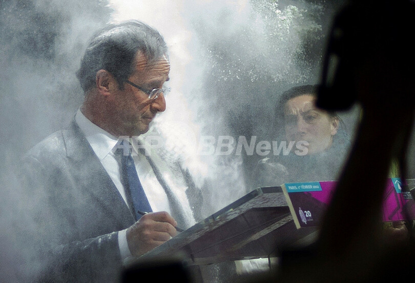 大統領選を前にしたフランス・パリ(Paris)で今年2月、女性から小麦粉を投げつけられる野党社会党(Socialist Party)のフランソワ・オランド(Francois Hollande)党首(当時、2012年2月1日撮影)。(c)AFP/FRED DUFOUR
