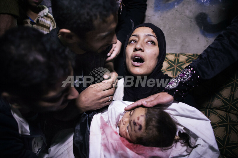 パレスチナ自治区のガザ地区(Gaza Strip)で、イスラエルの空爆で前日に死亡した生後10か月の女児の葬儀を前に、我が子を抱き嘆き悲しむ母親(2012年11月16日撮影)。(c)AFP/MARCO LONGARI