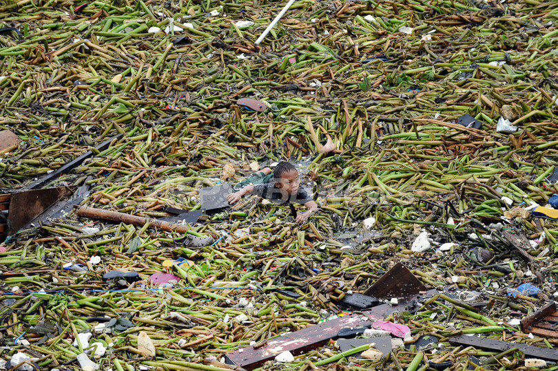 フィリピン・マニラ(Manila)の不法居住者が暮らす地区で7月、台風9号(アジア名:サオラ、Saola)による暴風雨で破壊された住まいから、持ち物を運びだそうと、がれきの中を泳ぐ少年。
