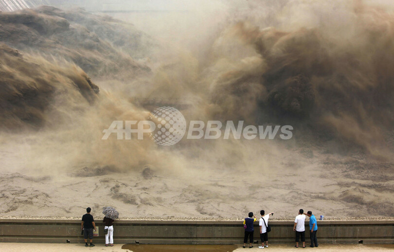 中国・河南(Henan)省の済源(Jiyuan)市で7月、黄河(Yellow River)の堆積物を取り除き、周辺地域の洪水を防ぐため、小浪底(Xiaolangdi)ダムの「調水調砂」が行われた。写真は、大量の放水に見入る観光客たち。