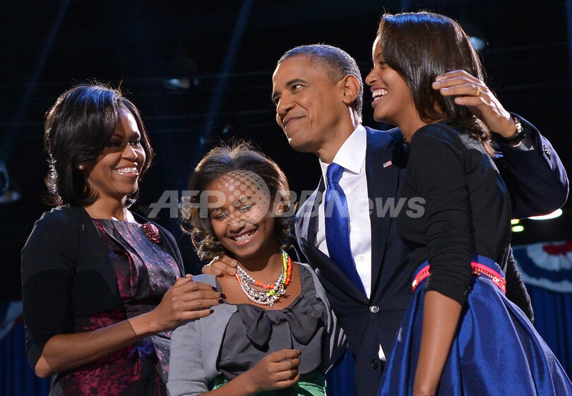 米大統領選で再選を果たし、勝利宣言を行うためイリノイ(Illinois)州シカゴ(Chicago)のステージ上に登場したバラク・オバマ(Barack Obama)大統領とミシェル(Michelle Obama)夫人、娘のマリア(Malia Obama)さん(右)とサーシャ(Sasha Obama)さん(中央)。