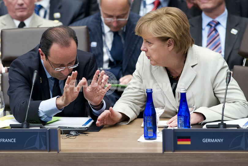 米シカゴ(Chicago)で5月に行われた北大西洋条約機構(NATO)首脳会議で話し込む、ドイツのアンゲラ・メルケル(Angela Merkel)首相と、フランスのフランソワ・オランド(Francois Hollande)大統領(2012年5月21日撮影)。(c)AFP/Saul LOEB