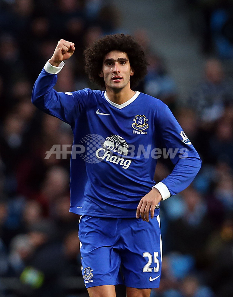 前半33分に先制点を決め喜ぶエバートンのマルアン・フェライニ(Marouane Fellaini、2012年12月1日撮影)。(c)AFP/IAN MACNICOL