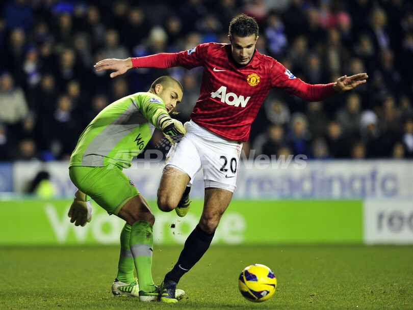 レディングのGKアダム・フェデリチ(Adam Federici、左)とボールを競るマンチェスター・ユナイテッドのロビン・ファン・ペルシー(Robin Van Persie、2012年12月1日撮影)。(c)AFP/GLYN KIRK