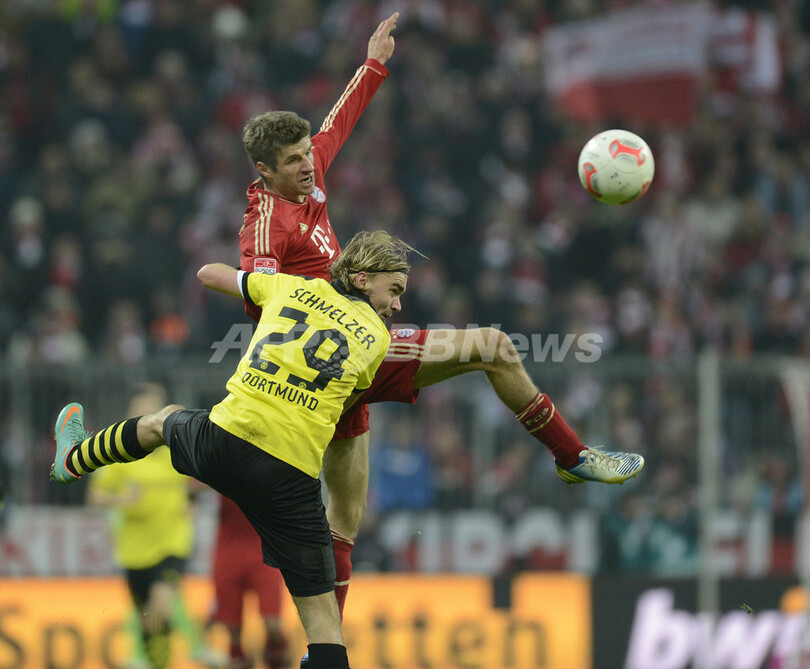 ボールを競るボルシア・ドルトムントのマルセル・シュメルツァー(Marcel Schmelzer、手前)とバイエルン・ミュンヘンのトーマス・ミュラー(Thomas Mueller、2012年12月1日撮影)。(c)AFP/CHRISTOF STACHE