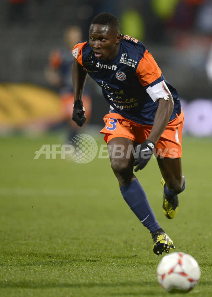 ドリブルでボールを運ぶモンペリエのマプ・ヤンガ・ムビワ(Mapou Yanga-Mbiwa、2012年12月1日撮影)。(c)AFP/PHILIPPE DESMAZES