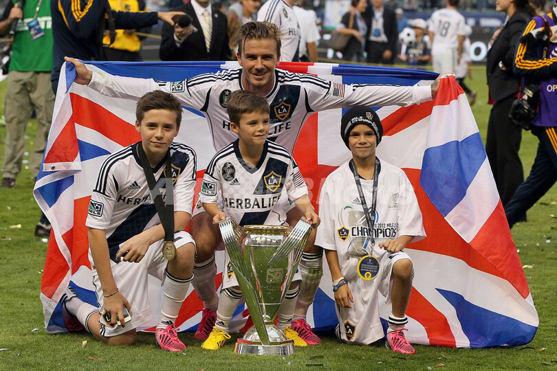 3人の息子(左から)、ブルックリン(Brooklyn)君、クルーズ(Cruz)君、ロメオ(Romeo)君との記念撮影に収まるロサンゼルス・ギャラクシーのデビッド・ベッカム(David Beckham、2012年12月1日撮影)。(c)AFP/Getty Images/Victor Decolongon