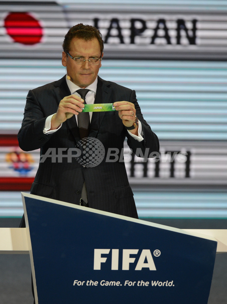 組み合わせ抽選会で日本のくじを引く国際サッカー連盟(FIFA)のジェローム・ヴァルケ(Jerome Valcke) 事務局長(2012年12月1日撮影)。(c)AFP/CHRISTOPHE SIMON