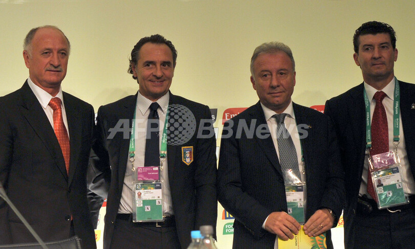 写真撮影に臨む(左から)ブラジル代表のルイス・フェリペ・スコラーリ(Luiz Felipe Scolari) 監督、イタリア代表のクラウディオ・チェーザレ・プランデッリ(Claudio Cesare Prandelli) 監督、日本代表のアルベルト・ザッケローニ(Alberto Zaccheroni) 監督、メキシコ代表のホセ・マヌエル・デ・ラ・トーレ(Jose Manuel de la Torre)監督(2012年12月1日撮影)。(c)AFP/YASUYOSHI CHIBA