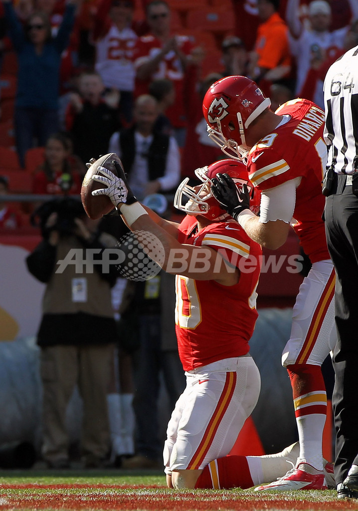 タッチダウンを挙げ歓喜するカンザスシティ・チーフスのペイトン・ヒリス(Peyton Hillis、2012年12月2日撮影)。(c)AFP/Getty Images/Jamie Squire