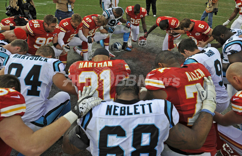 試合後に祈りをささげるカンザスシティ・チーフスとカロライナ・パンサーズの選手(2012年12月2日撮影)。(c)AFP/Getty Images/Peter Aiken