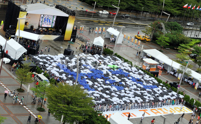 今回のイベントには、エバー航空(EVA Airways)や自転車メーカーのジャイアント(Giant)などの従業員らも参加。傘で「Hi」と描かれたQRコードを形作った。
