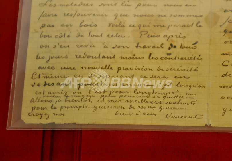 写真は、競売に先立ち不動産ブローカーのダグラス・エリマン(Douglas Elliman)のギャラリーで公開された、オランダの画家ゴッホ(Vincent van Gogh)が死の約7か月前にあたる1890年1月20日に書いた自署入り書簡。宛名は「ジヌー夫妻(M. & Mme. Ginoux)」で、ジョゼフ・ジヌー(Joseph Ginoux)とその妻のマリ(Marie Ginoux-Julien、2012年12月3日撮影)。(c)AFP/Stan HONDA