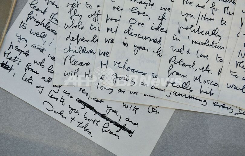 写真は、競売に先立ち不動産ブローカーのダグラス・エリマン(Douglas Elliman)のギャラリーで公開された、元ビートルズ(The Beatles)のジョン・レノン(John Lennon)と妻のヨーコ・オノ(Yoko Ono)さんがエリック・クラプトン(Eric Clapton)に宛て書いた手紙。1971年9月29日付けで「John and Yoko」の署名にて、クラプトンと共に新バンドを結成する可能性について書かれている(2012年12月3日撮影)。(c)AFP/Stan HONDA