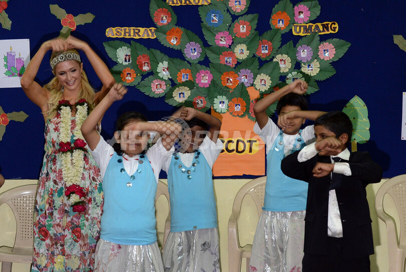 写真は児童養護施設で子どもたちとダンスするヒルトン(2012年12月3日撮影)。(c)AFP/INDRANIL MUKHERJEE