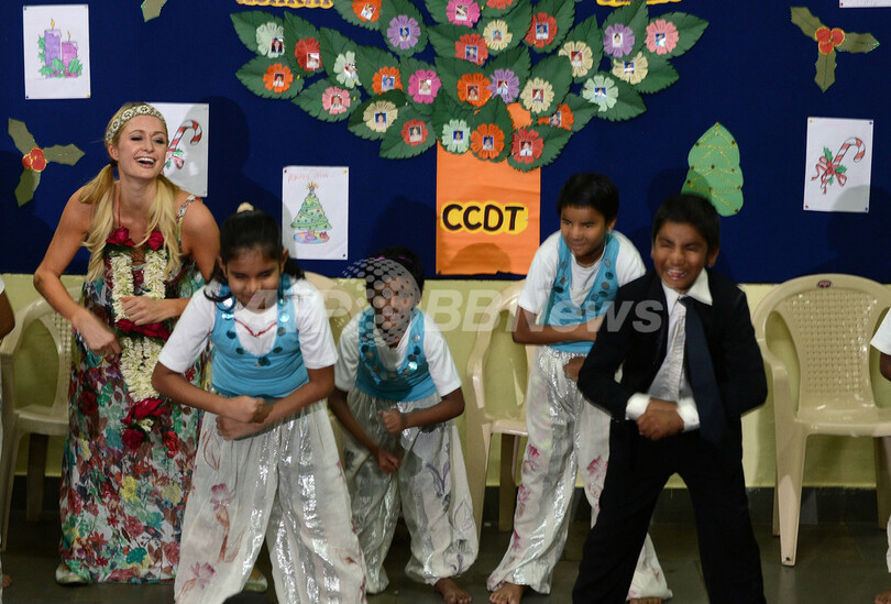 写真は児童養護施設で子どもたちとダンスするヒルトン(2012年12月3日撮影)。(c)AFP/INDRANIL MUKHERJEE