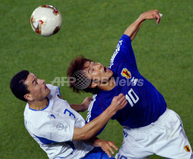 サッカーW杯日韓大会(2002 World Cup)グループH第2節、日本対ロシア戦で、ロシアのユリ・ニキフォロフ(Yuri Nikiforov、左)とボールを競る中山雅史(Masashi Nakayama、2002年6月9日撮影)。(c)AFP/ODD ANDERSEN
