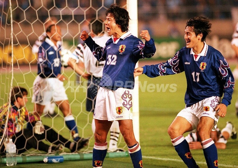 サッカーW杯フランス大会(World Cup 1998)アジア最終予選グループB第10節、日本対カザフスタン。得点を決め秋田豊(Yutaka Akita、右)らと歓喜する中山雅史(Masashi Nakayama、中央、1998年11月8日撮影)。(c)AFP