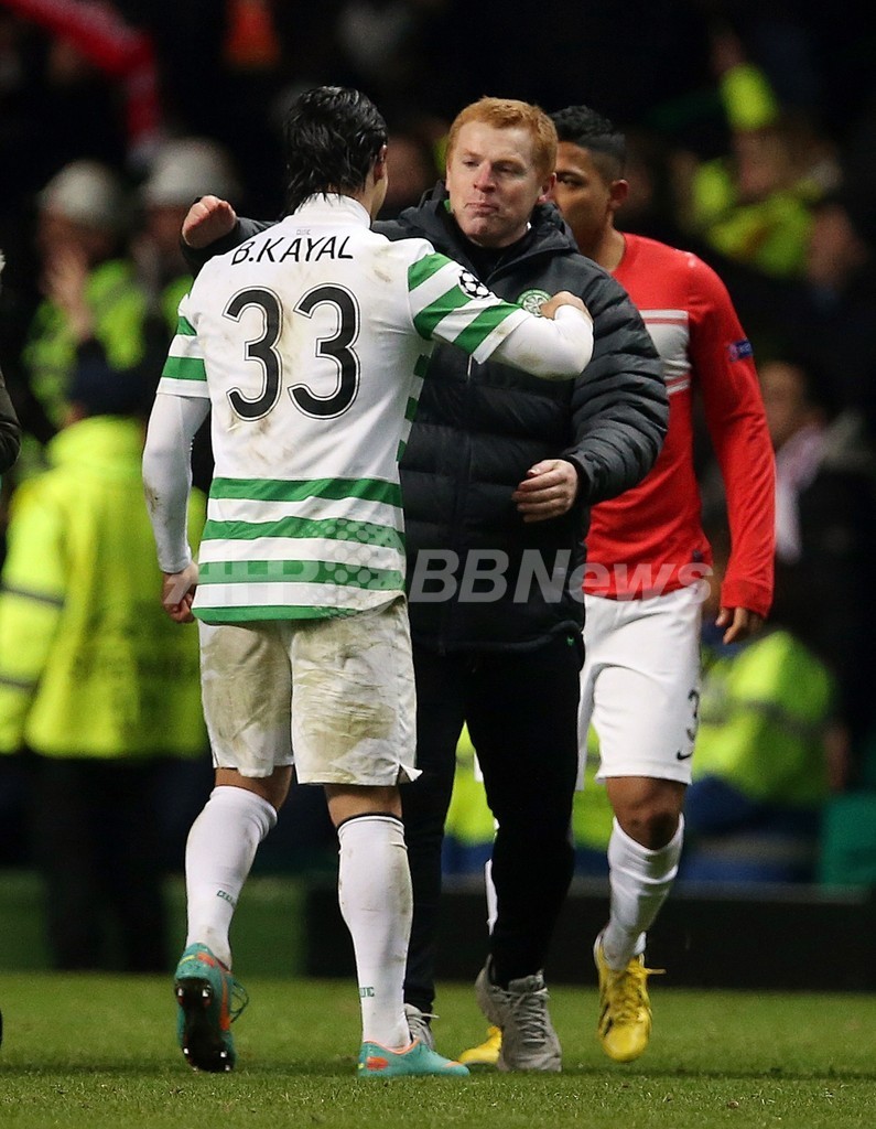 決勝トーナメント進出を決め、ベラム・カヤル(Beram Kayal、左)と喜ぶセルティックのニール・レノン(Neil Lennon)監督(2012年12月5日撮影)。(c)AFP/IAN MACNICOL