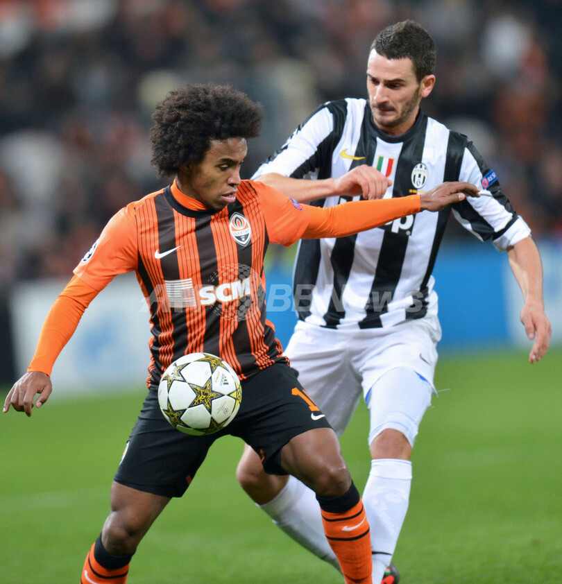 ユベントスのアンドレア・バルツァッリ(Andrea Barzagli、右)を背にボールをキープするシャフタール・ドネツクのウィリアン(Willian Borges da Silva、2012年12月5日撮影)。(c)AFP/SERGEI SUPINSKY