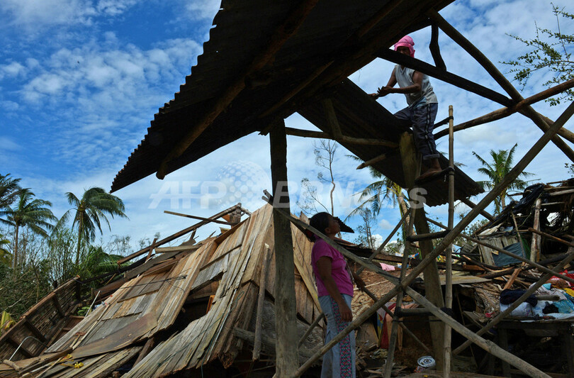 写真はコンポステラバレー(Compostela Valley)州のモンテビスタ(Monte Vista )で、台風24号で壊れた自宅の屋根を修理する夫婦(2012年12月5日撮影)。(c)AFP/TED ALJIBE
