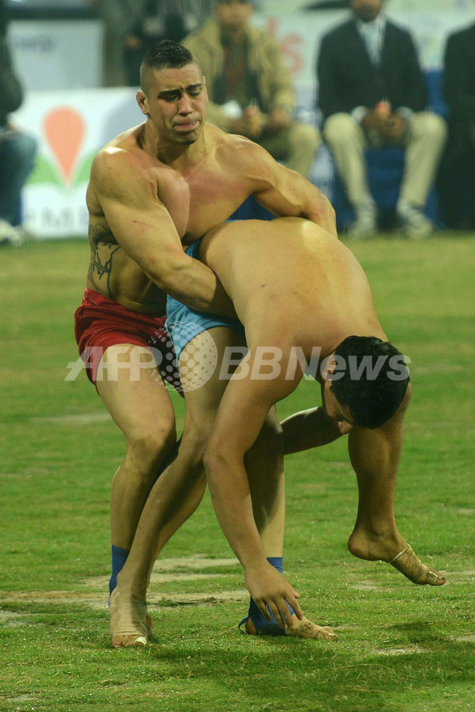写真はグル・ナーナク・スタジアム(Guru Nanak Stadim)で行われたアルゼンチン対米国の試合で、アルゼンチンの選手(右)が自陣に戻れないようキャッチした米国の選手(2012年12月4日撮影)。(c)AFP/NARINDER NANU