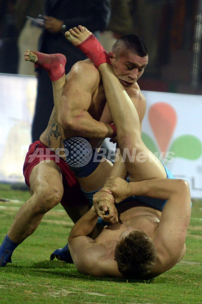 写真はグル・ナーナク・スタジアム(Guru Nanak Stadim)で行われたアルゼンチン対米国の試合で、アルゼンチンの選手(右)が自陣に戻れないようキャッチした米国の選手(2012年12月4日撮影)。(c)AFP/NARINDER NANU
