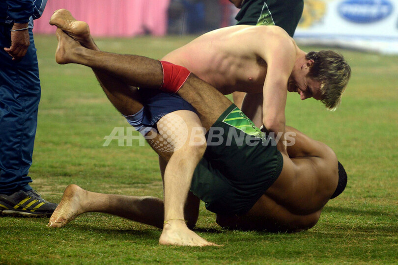 写真はグル・ナーナク・スタジアム(Guru Nanak Stadim)で行われたパキスタン対スコットランドの試合で、スコットランドの選手をキャッチして自陣に戻れなくするパキスタンの選手(2012年12月4日撮影)。(c)AFP/NARINDER NANU