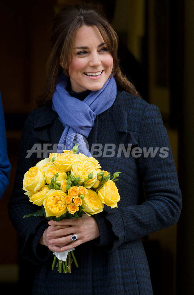 暗い色のコートと青いスカーフを身につけ、黄色いバラの花束を手にしたキャサリン妃は、笑顔を見せながらウィリアム王子とともに病院を出た。