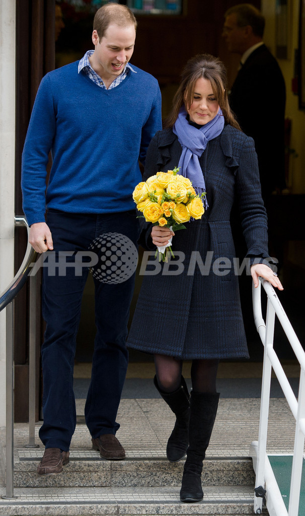 暗い色のコートと青いスカーフを身につけ、黄色いバラの花束を手にしたキャサリン妃は、笑顔を見せながらウィリアム王子とともに病院を出た。