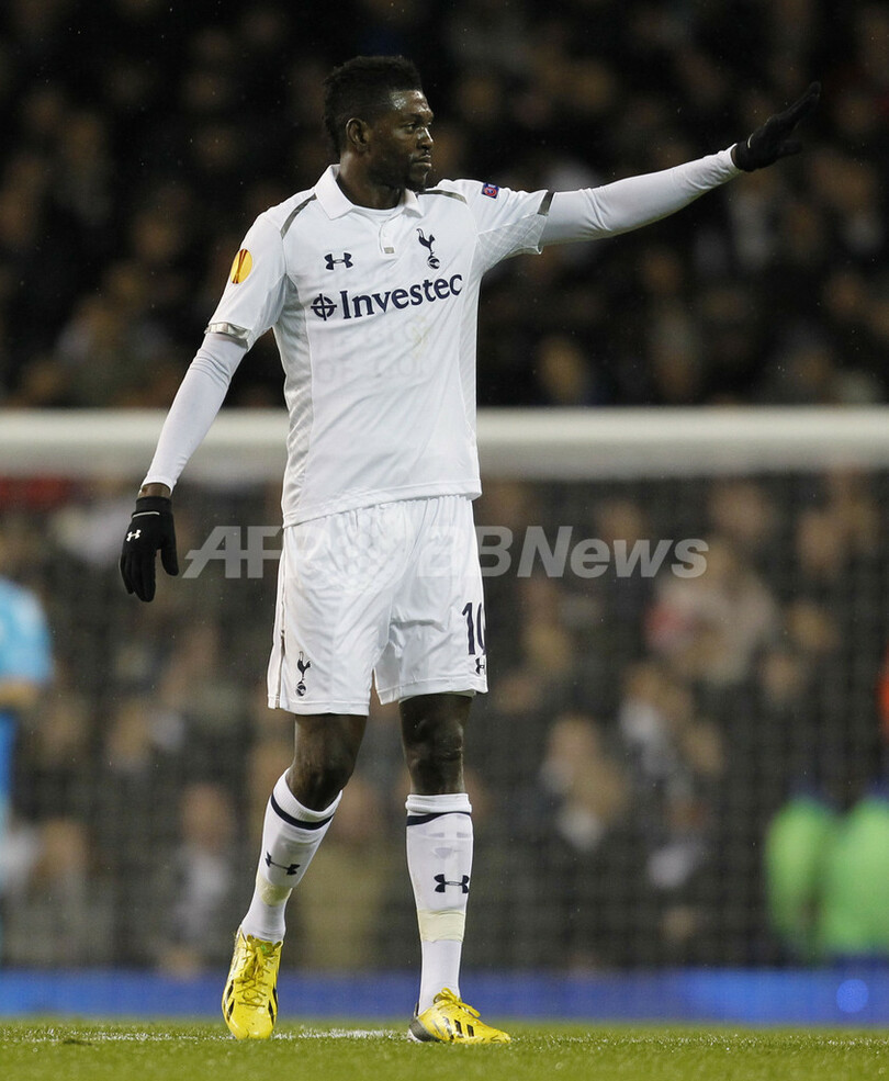 先制点を決め喜ぶトッテナム・ホットスパーのエマヌエル・アデバヨール(Emmanuel Adebayor、2012年12月6日撮影)。(c)AFP/IAN KINGTON